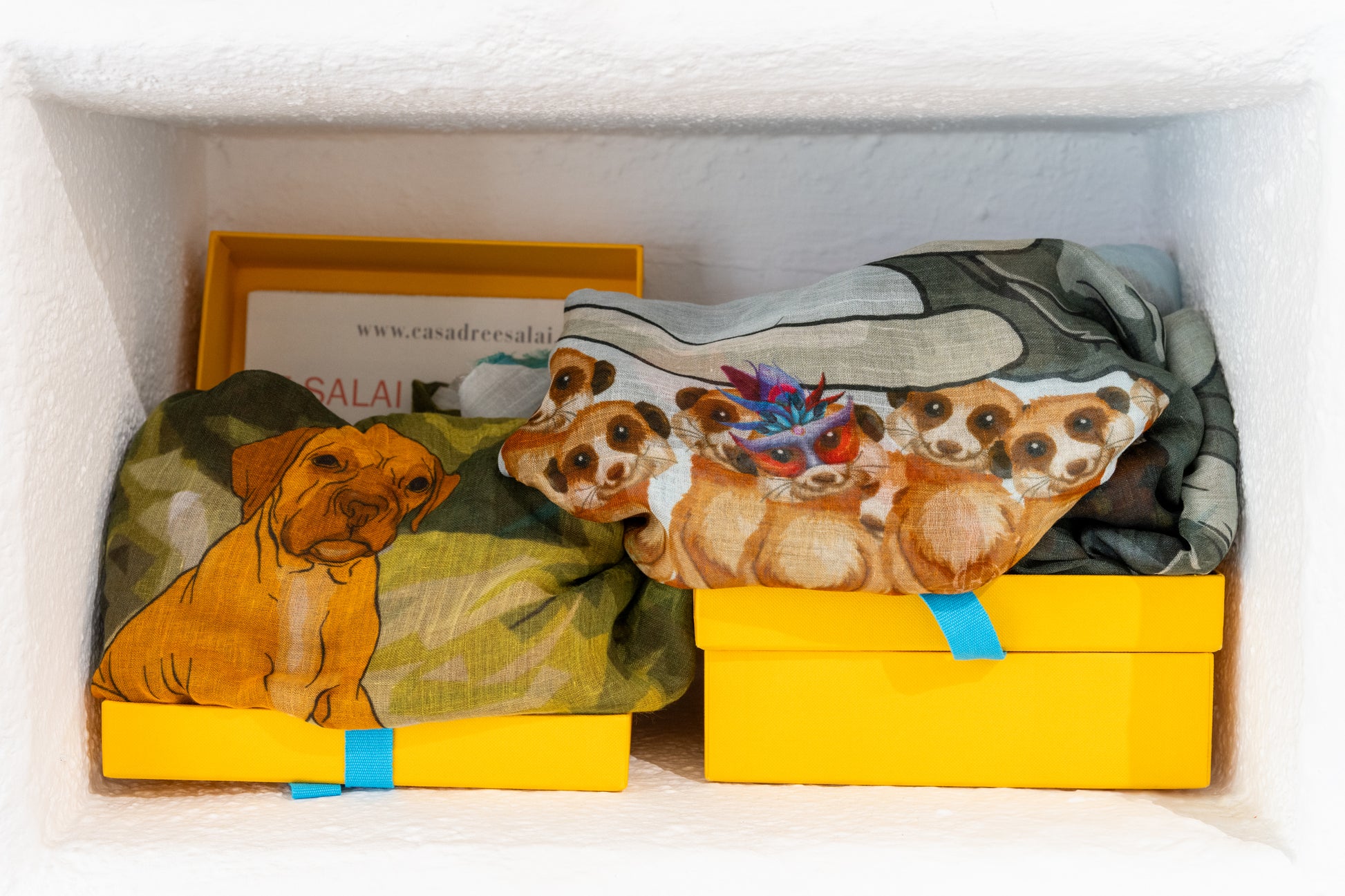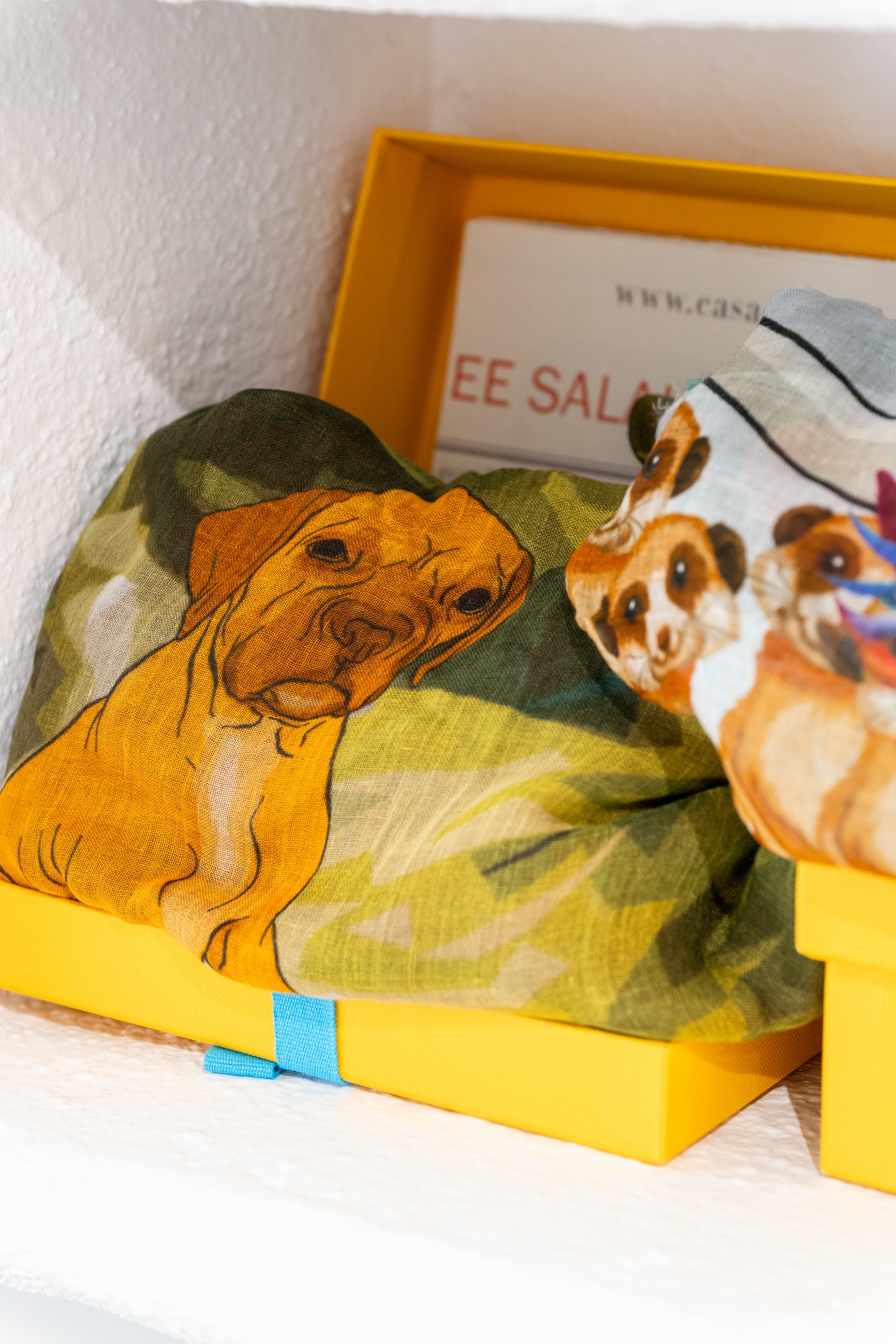 Foulards de la colección Casa Dree Salai, elaborados con 10% cachemira y 90% modal, 200x146 cm. Cada pieza es una interpretación única, como un capítulo de un libro.