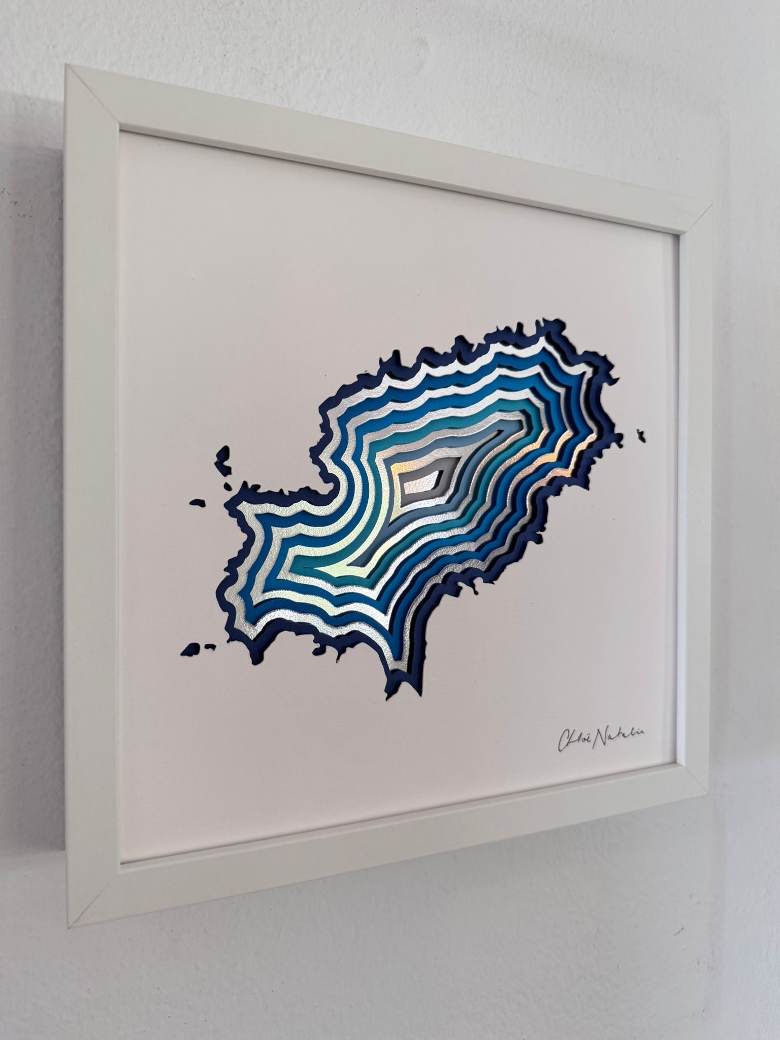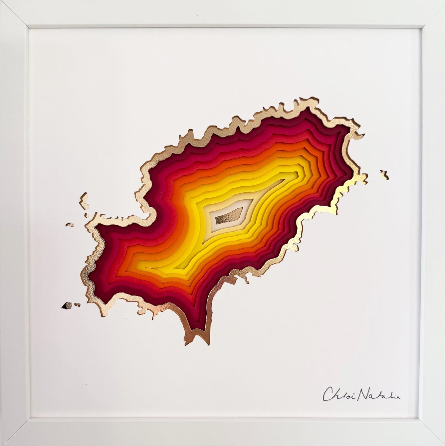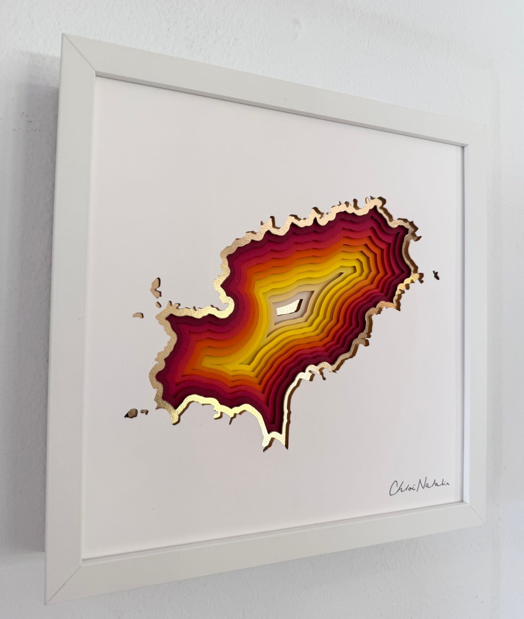 Paper Sculpture of Ibiza map in matte white frame.