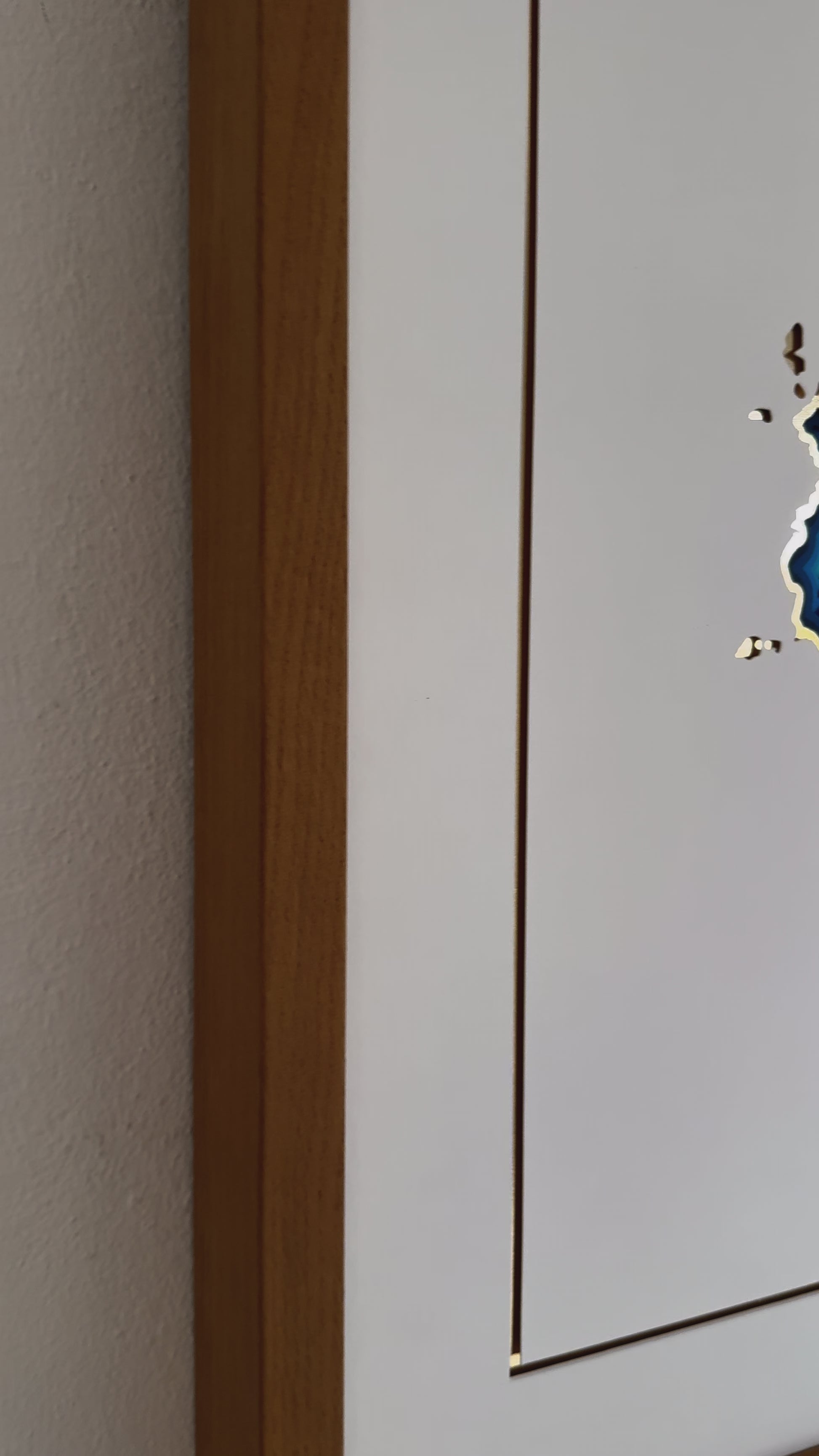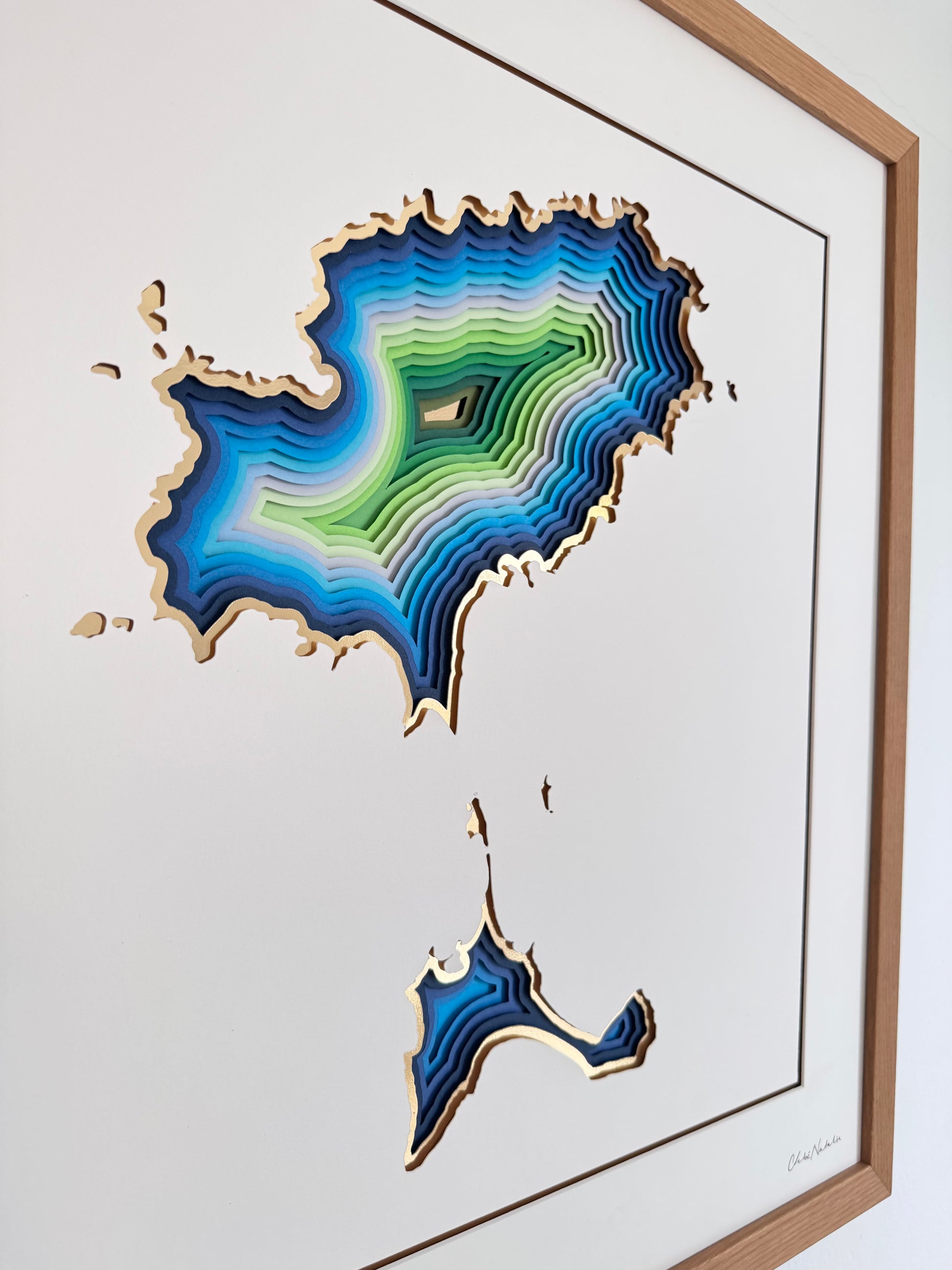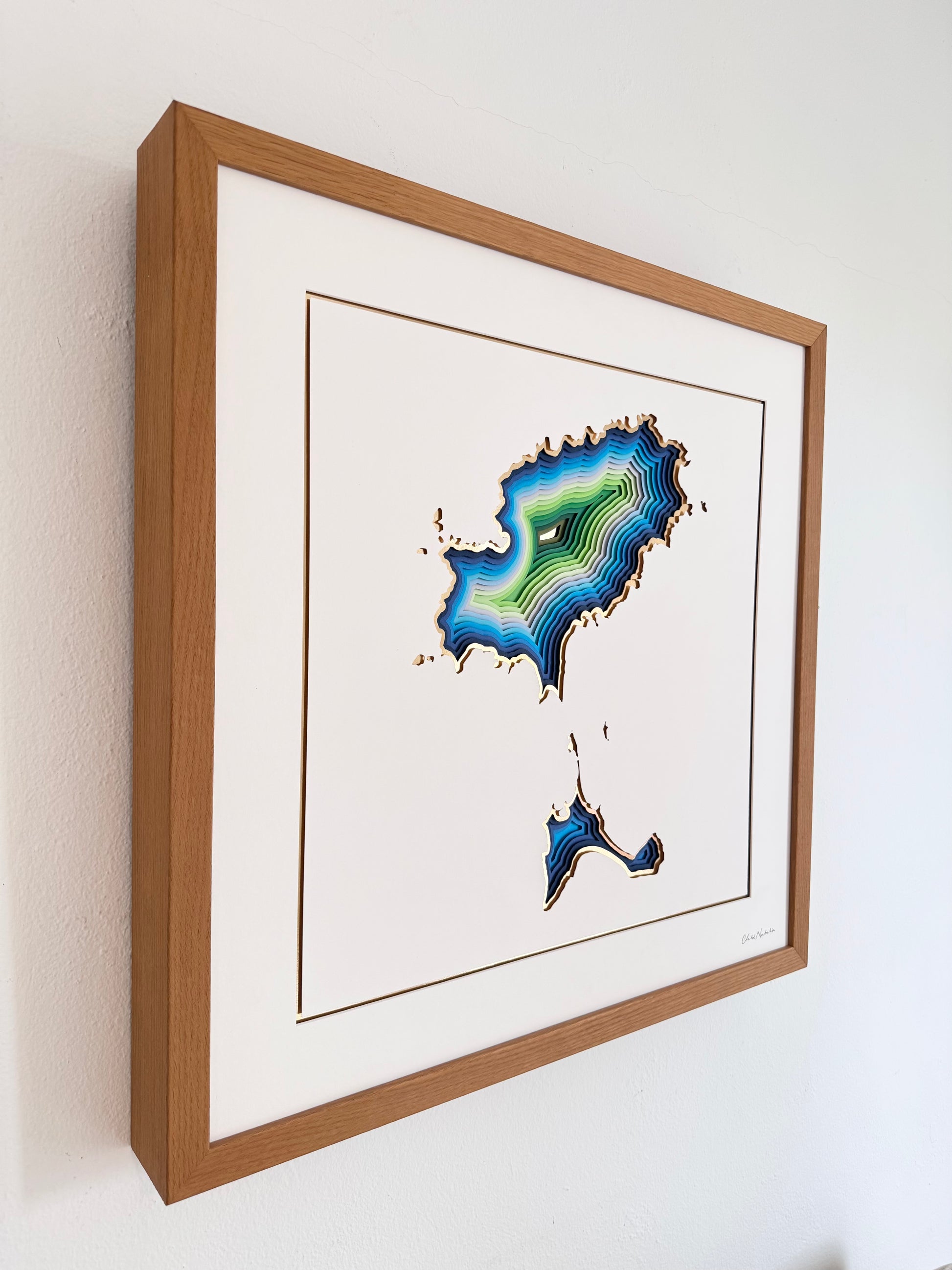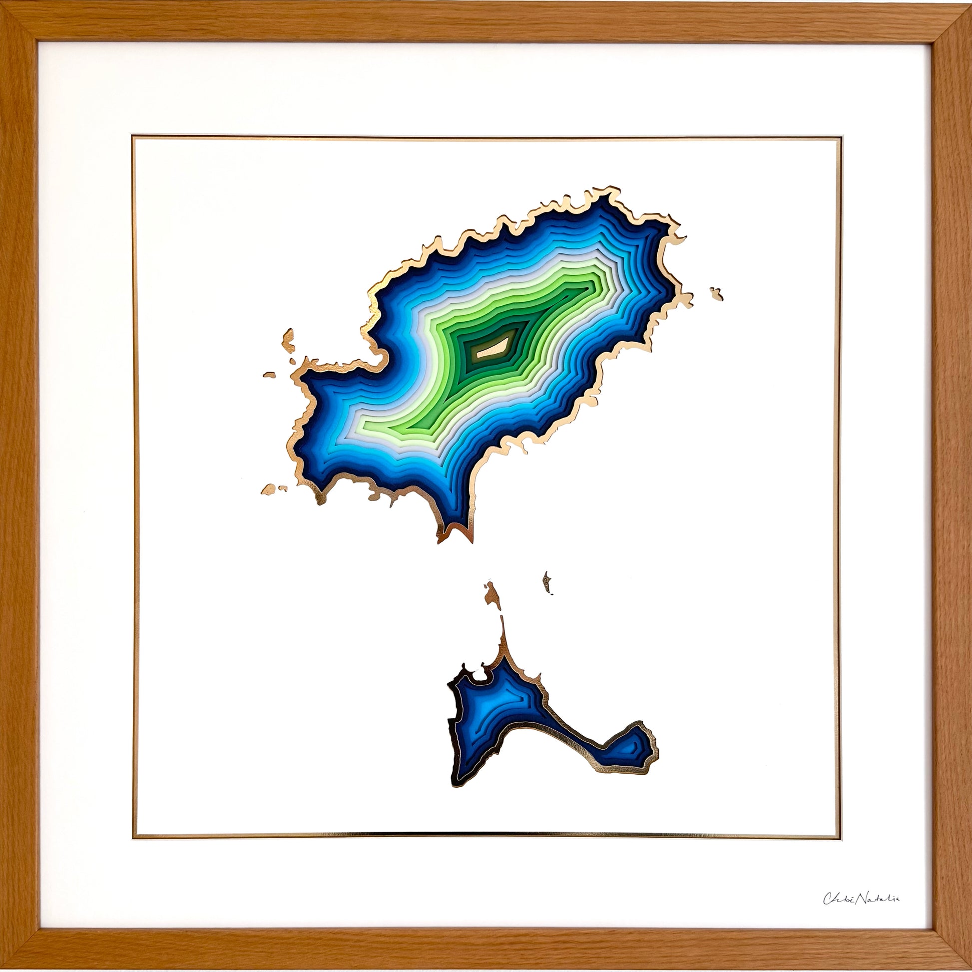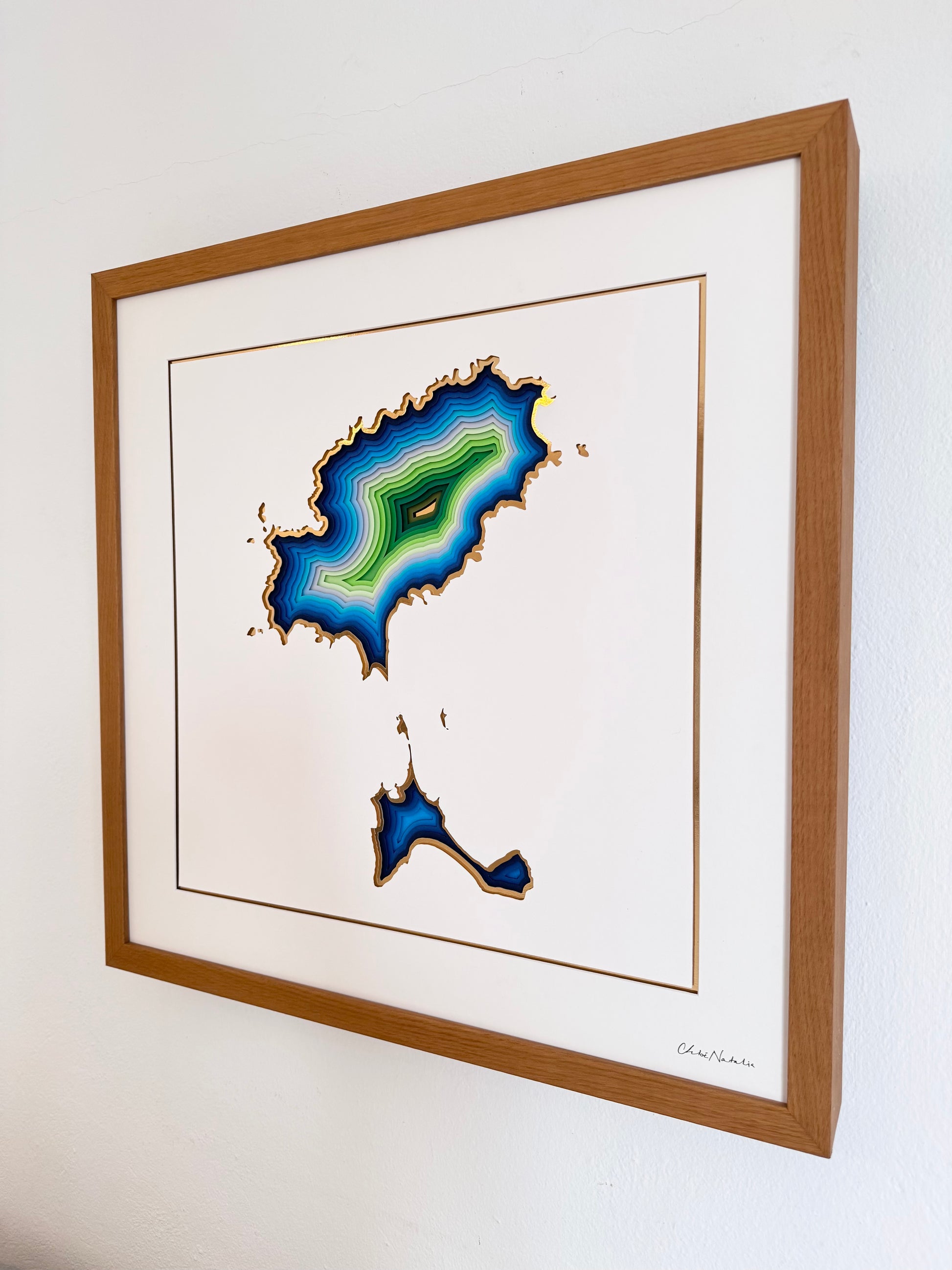 Paper Sculpture of Ibiza and Formentera maps in solid oak wood frame.