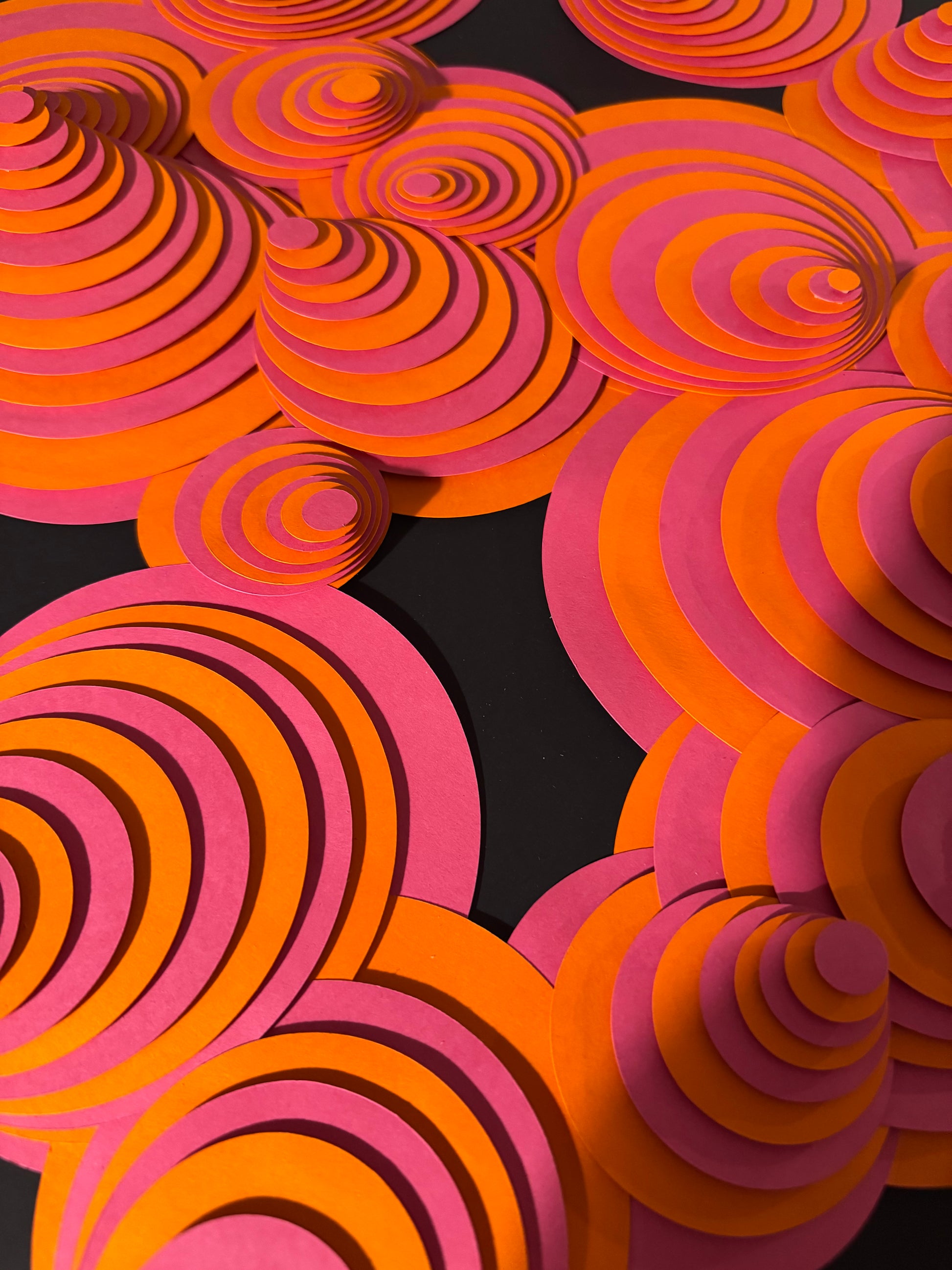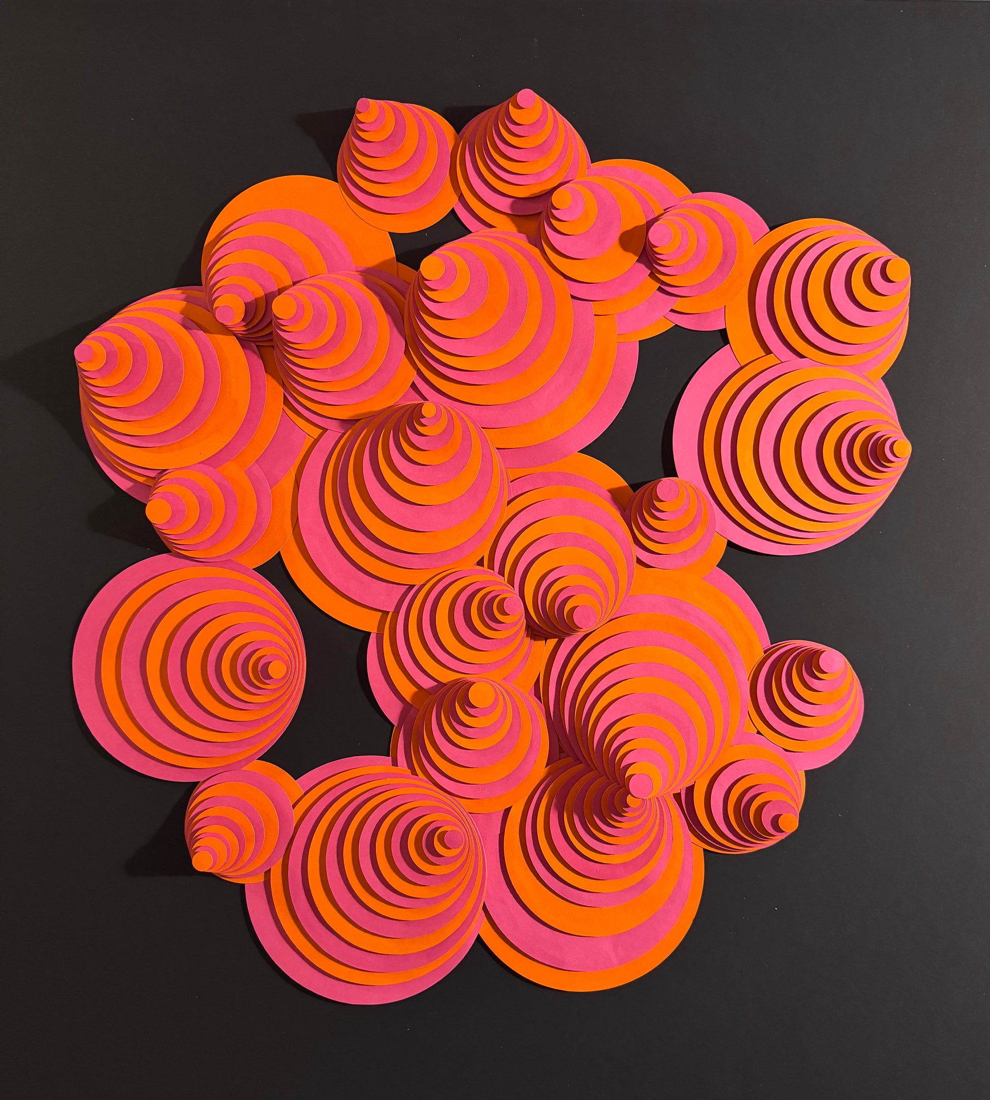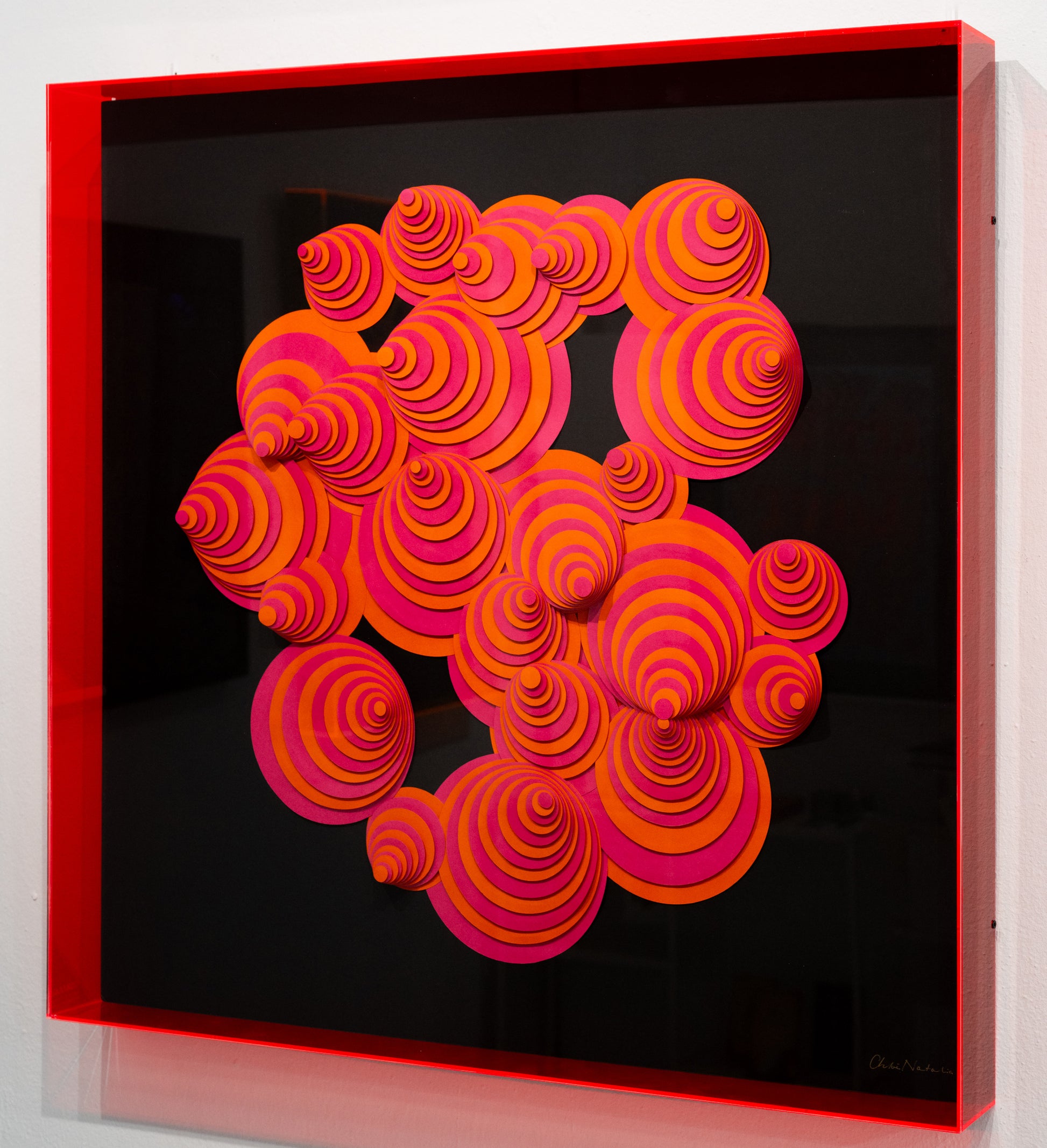 Paper Sculpture in plexiglass display case, neon pink sides.