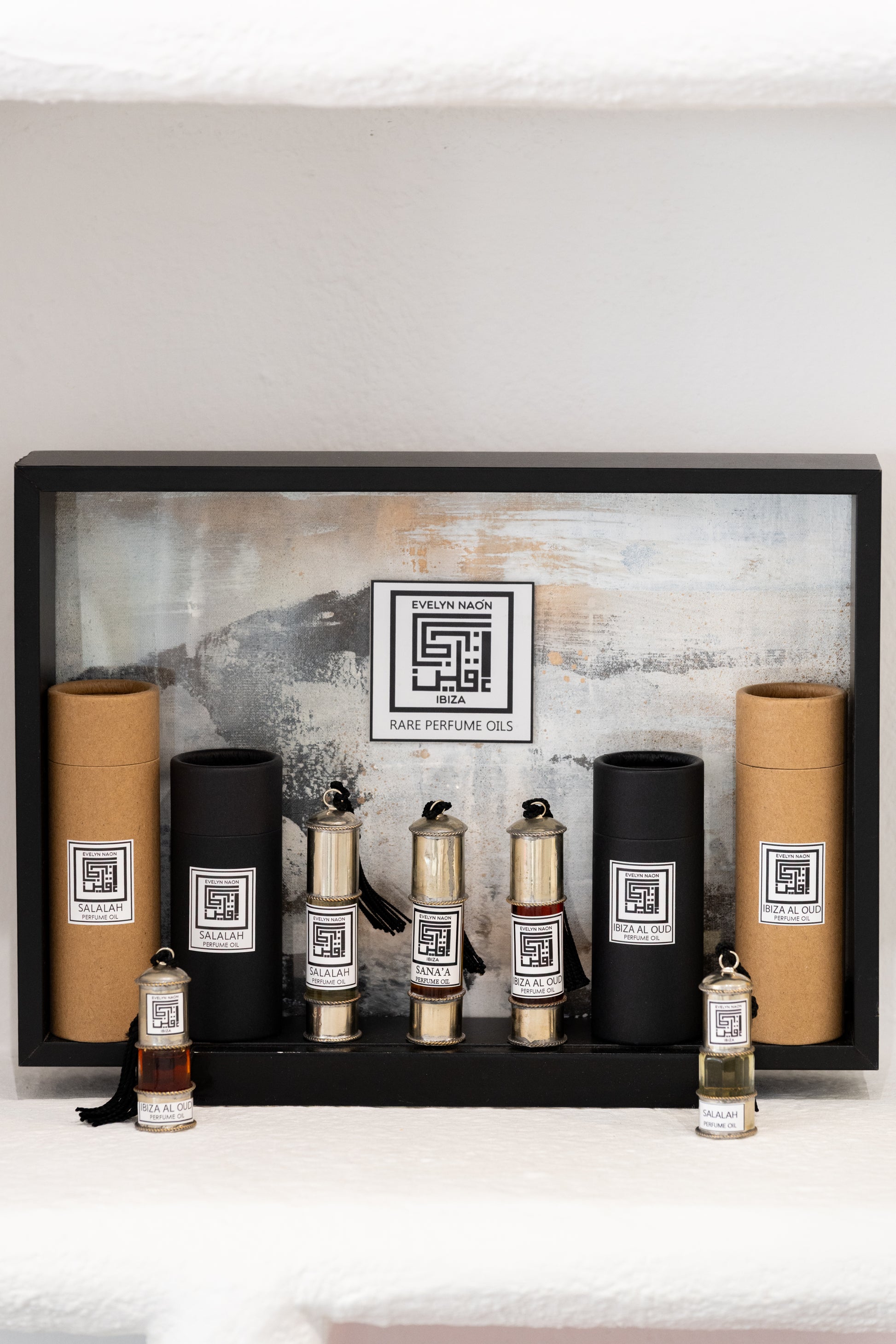 Aceites de perfume raros, inspirados en los vínculos históricos de Ibiza con Arabia, que capturan la esencia de la isla a través de una mezcla única de aromas ancestrales.