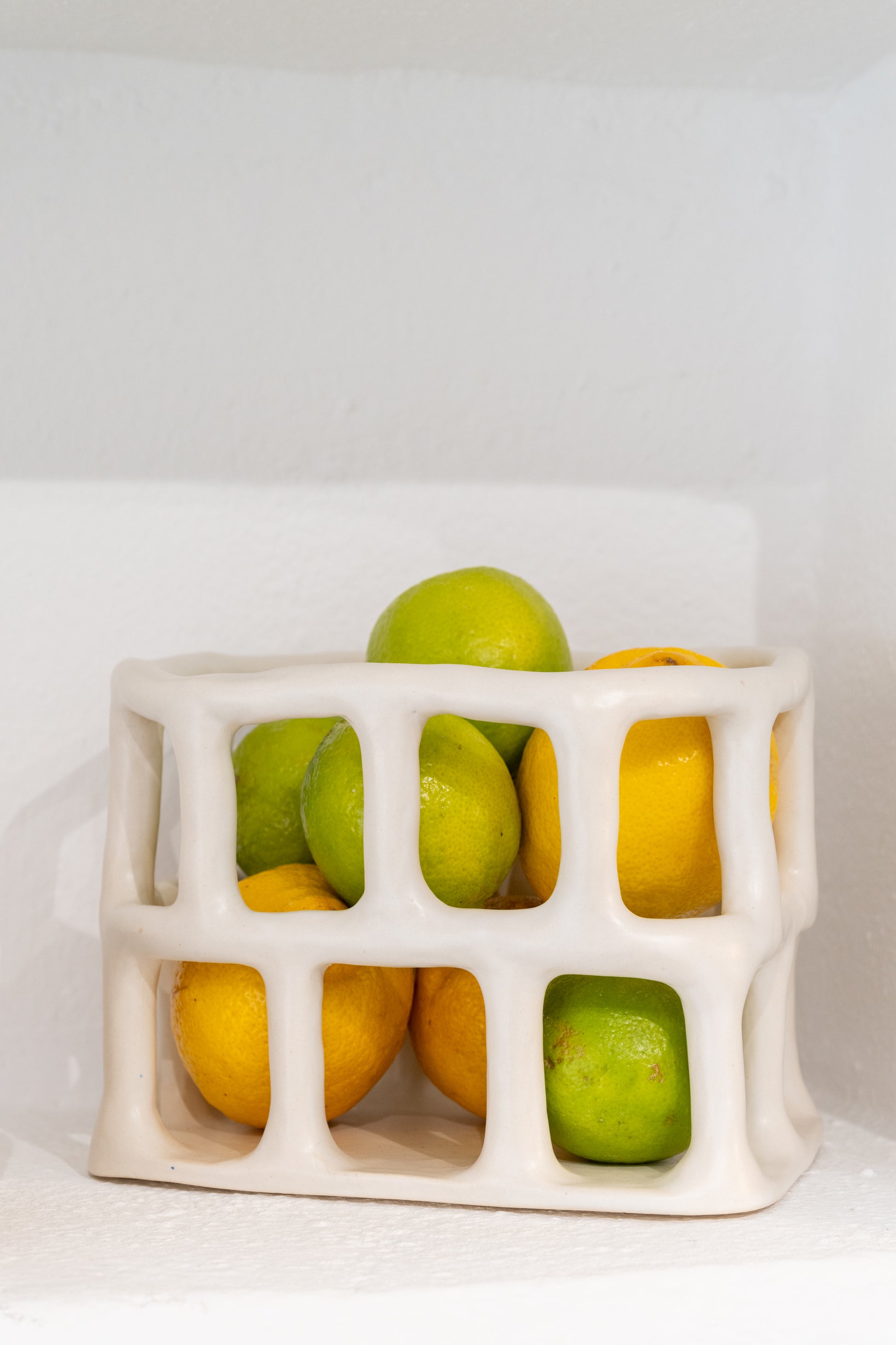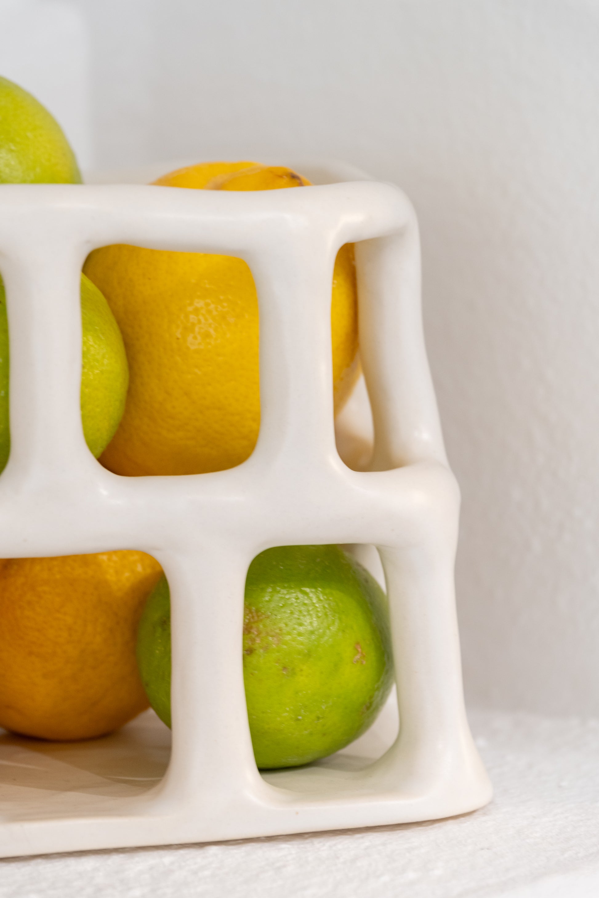 Frutero con forma de jaula, 13x20 cm. Diseño sencillo que fusiona funcionalidad y estética, inspirado en la pureza de las formas geométricas